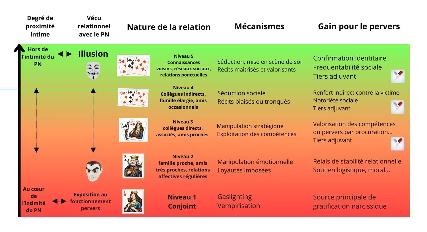 Dans cette architecture relationnelle, chacun occupe une place fonctionnelle. La victime nourrit la charge affective du pervers (vampirisme), le tiers adjuvant apporte la caution de légitimité sociale et intellectuelle, et le pervers tire de la réussite de ces deux manipulations la substance narcissique qui maintient son équilibre intérieur.