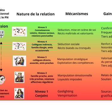 Cette exposition ne relève pas nécessairement d’une emprise au sens clinique, mais d’une participation involontaire à une imposture identitaire et sociale fondée sur un double visage : un masque social valorisé et un fonctionnement relationnel dissimulé.