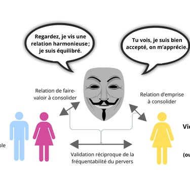 Les tensions que le pervers perçoit dans sa relation avec sa victime — ou avec des membres de son cercle familial — éveillent chez lui le sentiment d’être démasqué. Pour apaiser ces dissonances, il cherche alors une validation extérieure, un appui social obtenu grâce à des personnes trompées par le masque qu’il affiche. Ces tiers, utilisés comme adjuvants, servent à dissiper les suspicions et à maintenir sa victime sous son influence, dans le champ de son emprise.