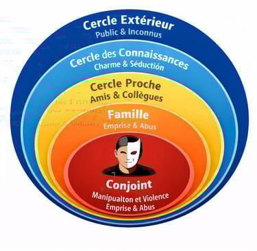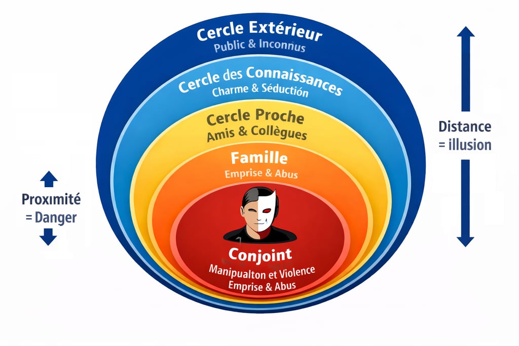 Cet article analyse ce décalage en s’appuyant sur le modèle des cercles relationnels, afin de comprendre comment le pervers narcissique organise ses liens sociaux et pourquoi ses victimes les plus proches sont souvent les moins crues.