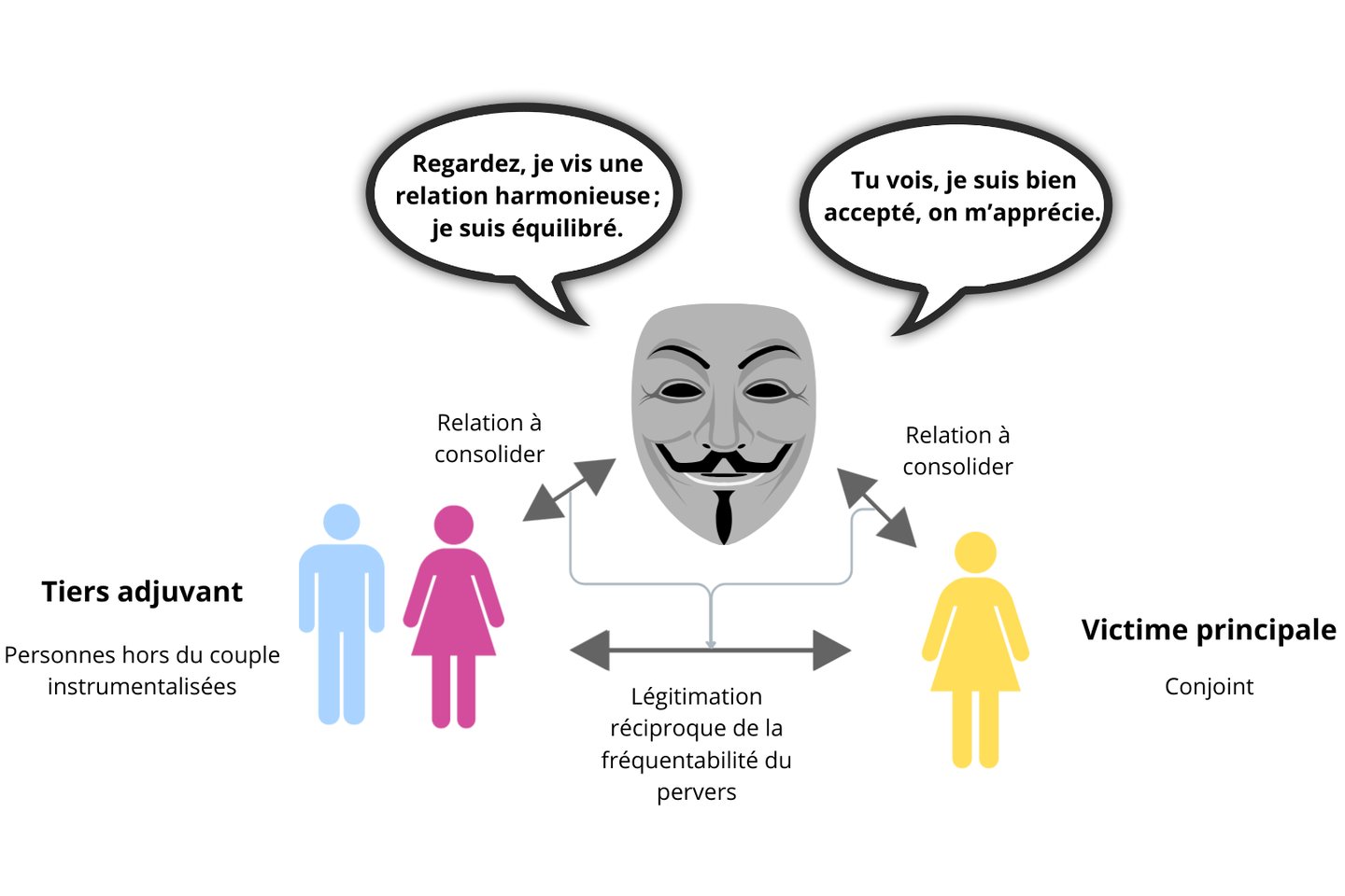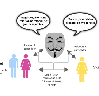 La triangulation s’organise autour de trois pôles : le pervers narcissique, la victime principale, et un tiers adjuvant.