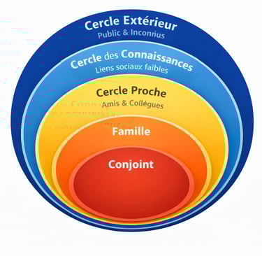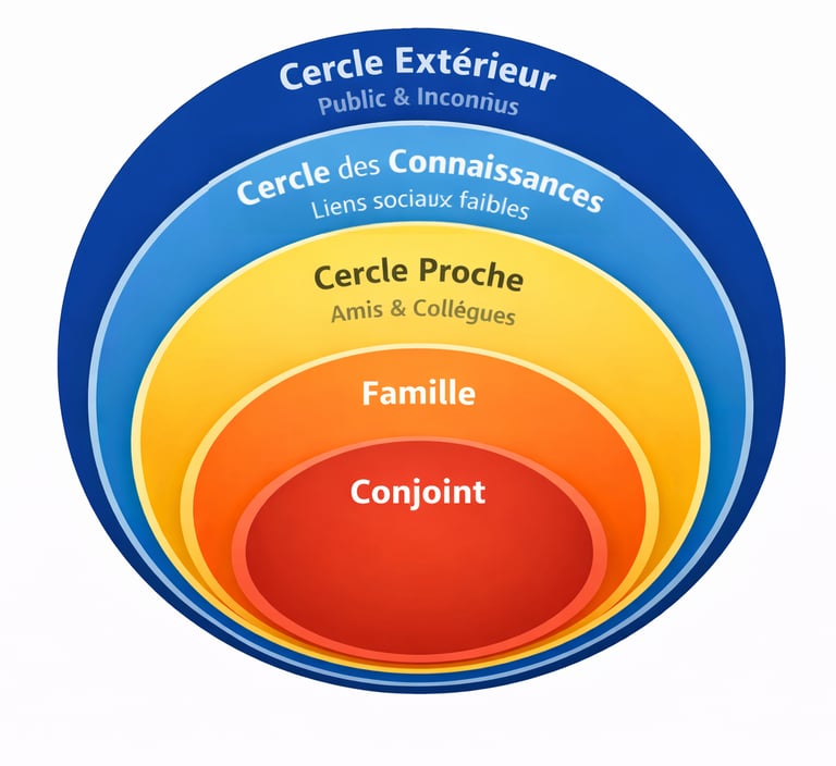 Les relations humaines s’organisent naturellement selon des cercles de proximité. Plus une relation est proche, plus elle implique de confiance, d’engagement émotionnel et de vulnérabilité. À l’inverse, les relations éloignées sont plus superficielles, socialement utiles, mais peu exposantes sur le plan affectif.
