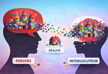 En manipulant le langage, le pervers formule l’édiction d'une fausse réalité. En façonnant son discours, il cherche à imposer cette recomposition de la réalité comme étant la réalité même.